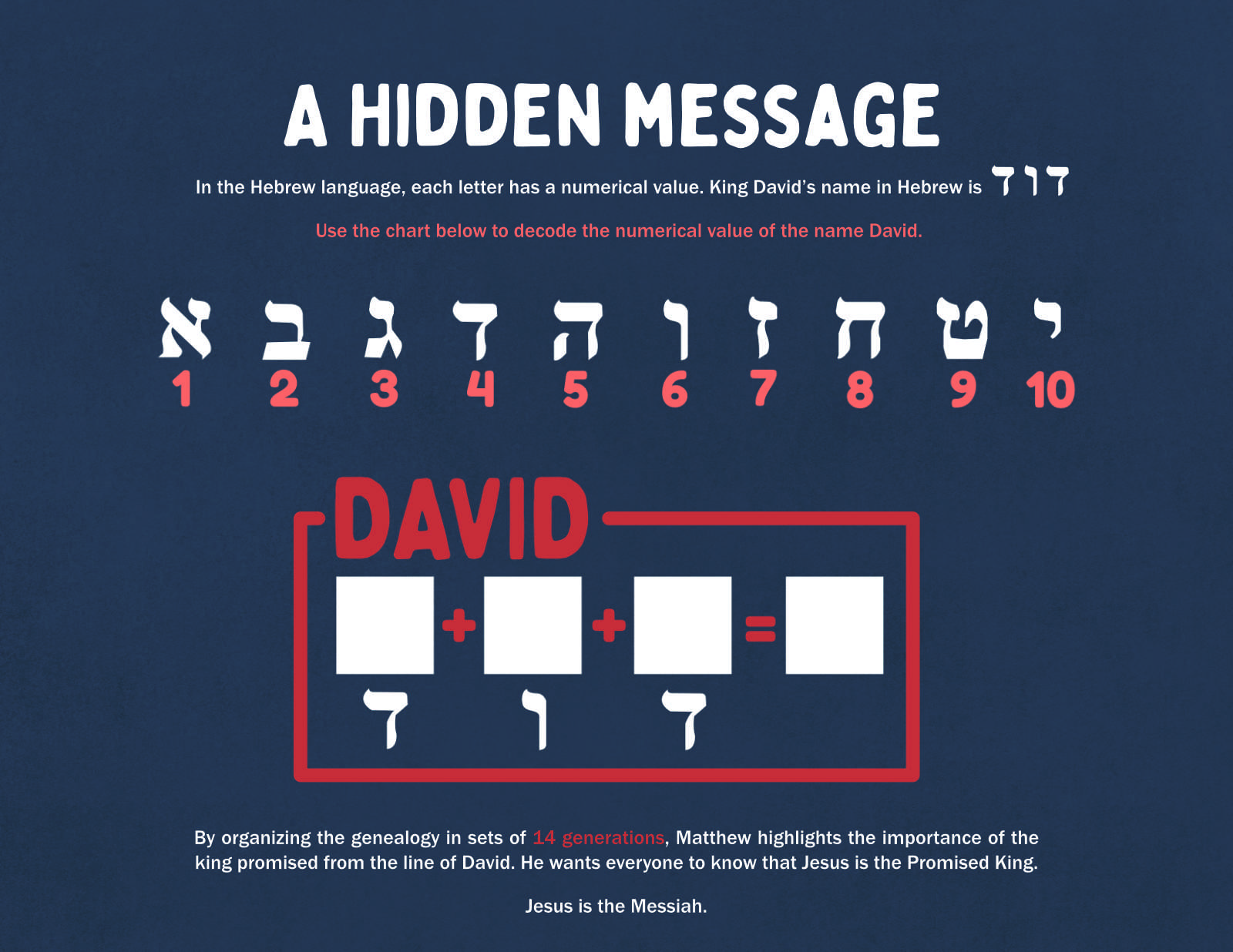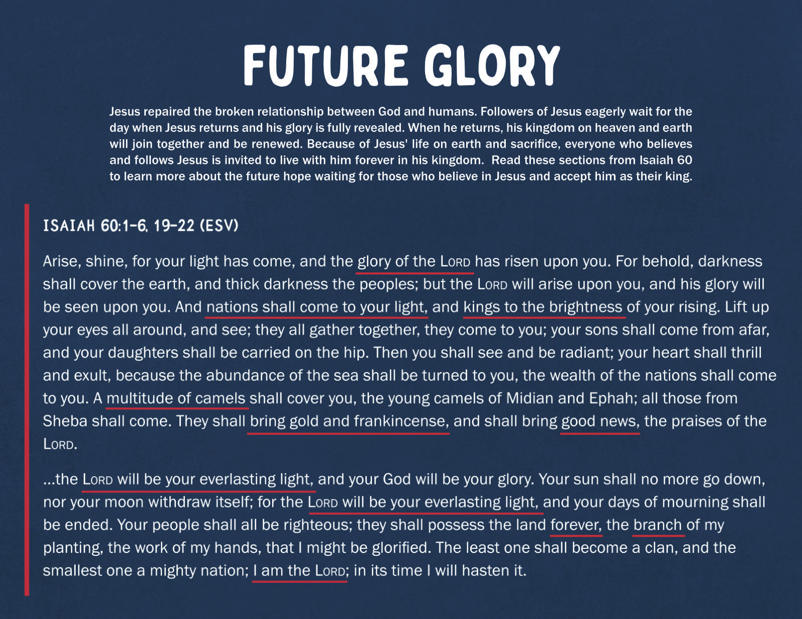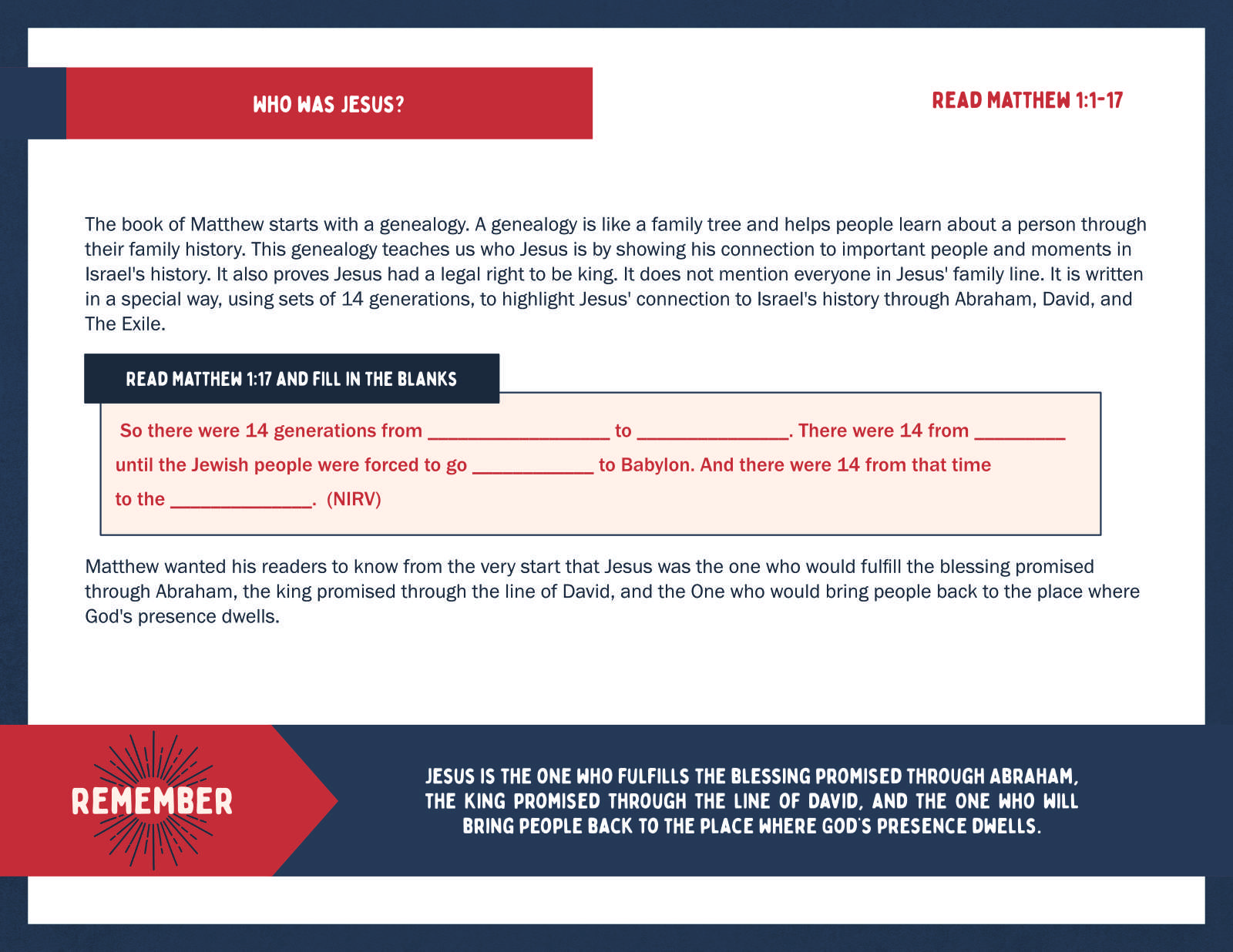 In this Bible study, kids and youth will journey through the story of Christ’s arrival, learning how Jesus is the one who fulfills the blessing promised through Abraham, the King promised through the line of David, and the one who will bring people back to the place where God’s presence dwells.
